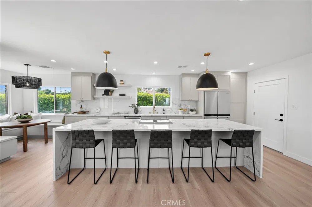 Stunning turnkey remodel in Tarzana with designer finishes throughout! Discover an unparalleled opportunity to reside in a coveted location in the San Fernando Valley. This meticulously designed and fully remodeled home offers luxury living with every detail thoughtfully crafted for your comfort and style. No expense was spared in the construction, with high-end fixtures, built-ins, and contemporary details like a stylish stucco fireplace enhancing the interior. This completely revitalized home was gutted and rebuilt with precision. This home boasts brand-new everything, including the roof, HVAC system, tankless water heater, floors, and appliances. The heart of the home, a custom kitchen, features a 13-foot island, energy-efficient appliances, ample storage, a built-in wine fridge, gorgeous stone countertops and backsplash, and a cozy breakfast nook that comfortably seats eight. The open floor plan features a family room and living room / den space and is an entertainer's dream with ample space for family and visitors. Nestled on a prime corner lot, the property is enveloped in lush hedges with serene greenery views and privacy from every window. The entire yard is fenced and gated, offering an additional layer of security. The luxurious primary suite is a private retreat with a sliding glass door leading to a dedicated porch and seating area just for you. A generously sized walk-in closet with custom shelving provides ample storage to keep clothing, shoes, and accessories organized and accessible. Two additional bedrooms are perfect for family or guests. The finished two-car garage includes a built-in washer and dryer, a utility sink, and epoxy floors. Enjoy California's perfect weather in the tranquil and spacious backyard, expertly designed by an award-winning landscape architect and best-selling author on garden design. This serene and spacious outdoor areas are a paradise perfect for relaxation, entertaining, and al fresco dining. Located in a prime area, this home offers easy access to the freeway. Upcoming plans for a new Trader Joe’s within walking distance and proximity to restaurants add to the convenience. Families will appreciate the closeness to schools. Seize this rare opportunity to move into a completely remodeled, designer-finished home in Tarzana. Experience luxury living in one of the most desirable locations in the San Fernando Valley.